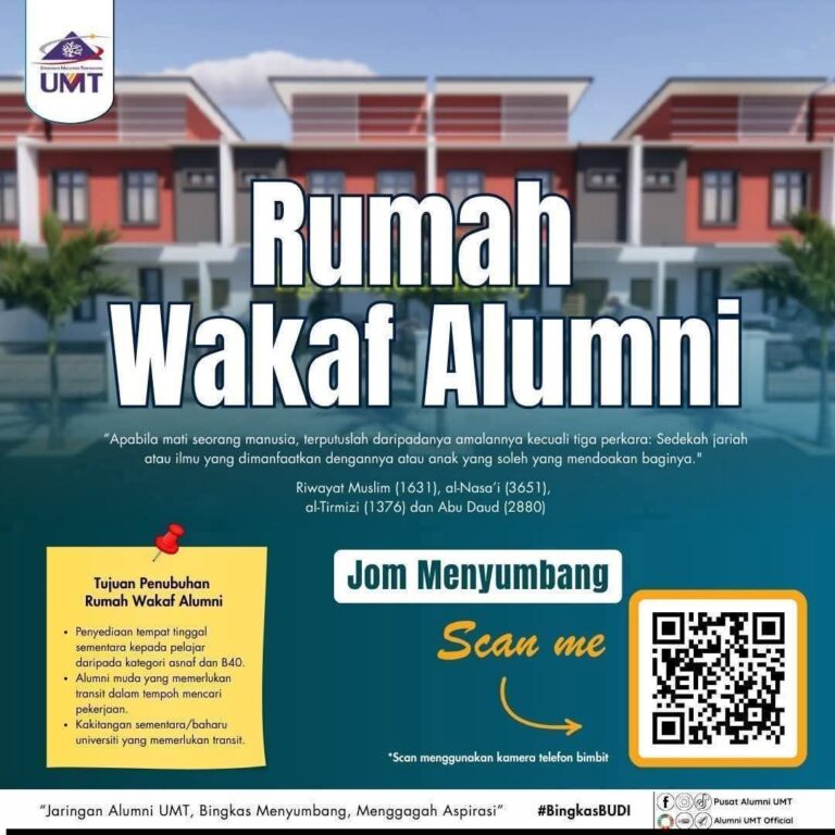 RUMAH WAKAF ALUMNI UMT– Seruan Kasih buat Alumni Budiman Pusat Alumni, Universiti Malaysia Terengganu berhasrat untuk menubuhkan Rumah Wakaf Alumni sebagai pusat sehenti yang kondusif...